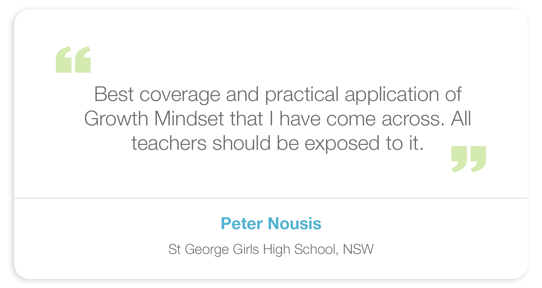 The Growth Mindset Teacher will contribute 8 hours and 30 minutes of NESA Registered PD addressing 5.1.2, 6.6.6 and 6.3.2 from the Australian Professional Standards for Teachers towards maintaining Proficient Teacher Accreditation in NSW.
